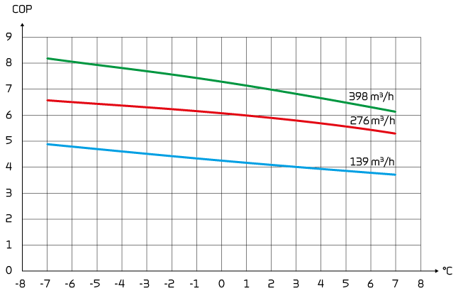 Topný faktor COP [-] jako funkce venkovní teploty [°C] a objemového průtoku qv [m3/h] podle EN 14511 při teplotě odpadního vzduchu = 21 °C.