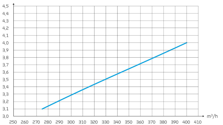 Energetický poměr EER [-] pro přiváděný vzduch v závislosti na objemovém průtoku [m3 / h] dle normy EN 14511 při teplotě odváděného vzduchu = 27 °C a venkovní teplotě vzduchu = 35 °C.