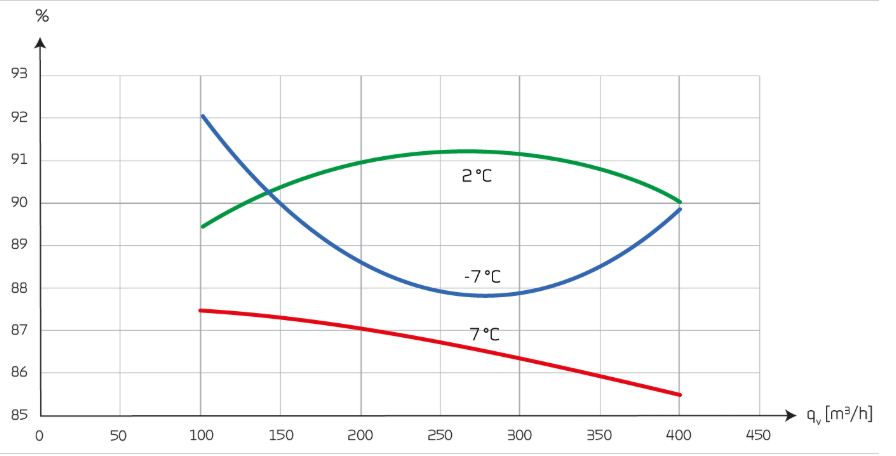 Účinnost rekuperace standardní jednotky s protiproudým výměníkem. Testováno podle EN13141-7, účinnost za sucha.