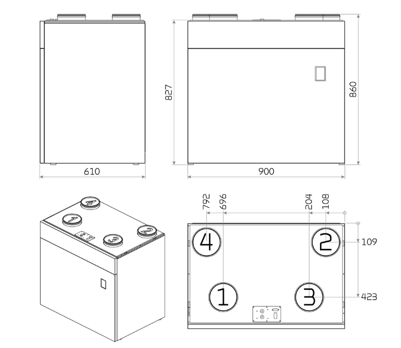 | Výměna vzduchu | Plynulé nastavení čtyř stupňů ventilace. Přívodní a odtahový ventilátor lze nastavit individuálně | + |