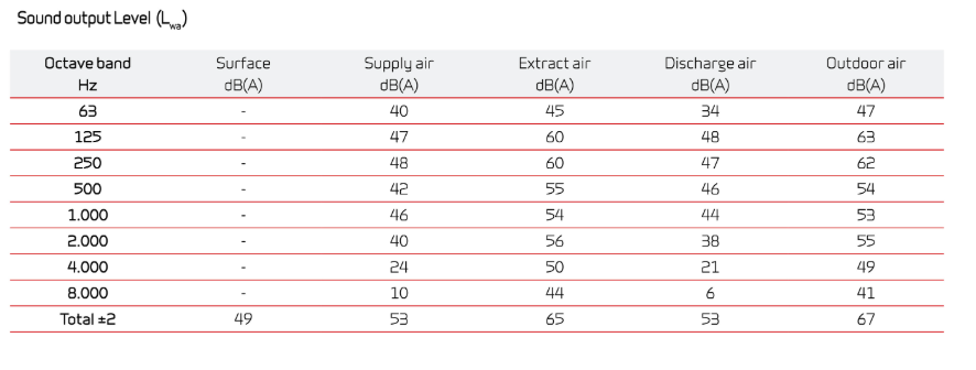 Testováno podle EN 9614-2 pro povrch a EN 5136 pro potrubí. Hladina akustického výkonu LWA klesá se zploštěním objemu vzduchu a snižováním protitlaku. Hladina akustického tlaku LPA v dané vzdálenosti bude záviset na akustických podmínkách v místě instalace.