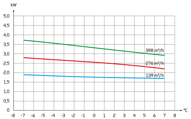 Topný výkon Qc [W] jako funkce objemového průtoku qv [m3/h] a teploty venkovního vzduchu [°C], podle EN 14511 odpadní vzduch = 21 °C.