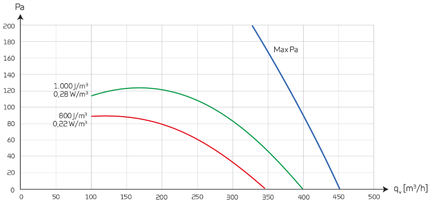Větrací výkon standardní jednotky jako funkce větracího objemu a externí tlakové ztráty. Testováno podle normy EN13141-7 se filtrem dle třídy ISO hrubost > 90 % (G4) a bez dohřevu vzduchu. Hodnoty SEL obsahují celkovou spotřebu elektřiny jednotky bez ovladače.