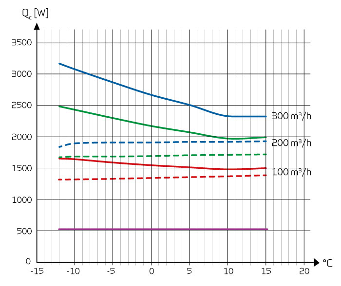 Topný výkon Qc [W] jako funkce objemového průtoku qv [m3/h] a teploty venkovního vzduchu [°C], podle EN 14511 odpadní vzduch = 21 °C.