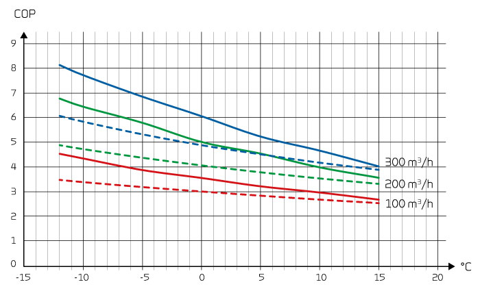 Tepelný součinitel COP vzduchu jako funkce venkovní teploty [ºC] a objemového průtoku [m3/h] podle EN 14511 vzduch i = 21 °C.