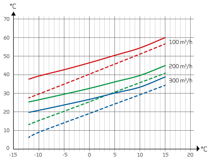 Osa X: Teplota venkovního vzduchu. Osa Y: Teplota přiváděného vzduchu. Tečkovaná křivka: Bez tepelné trubice FU15. Pevná křivka: S tepelnou trubkou FU15