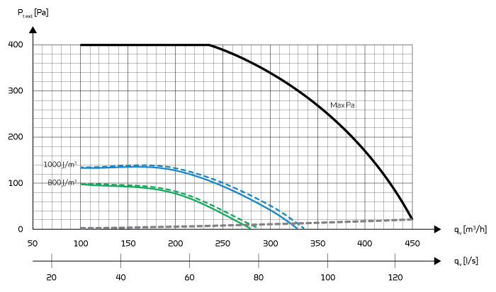 Zvuková data platí pro qv = 210 m3 / ha Pt ext = 100 Pa. Testováno podle EN 9614-2 pro povrch a EN 5136 pro potrubí. Hladina akustického výkonu LWA klesá se zploštěním objemu vzduchu a snižováním protitlaku. Hladina akustického tlaku LPA v dané vzdálenosti bude záviset na akustických podmínkách v místě instalace.