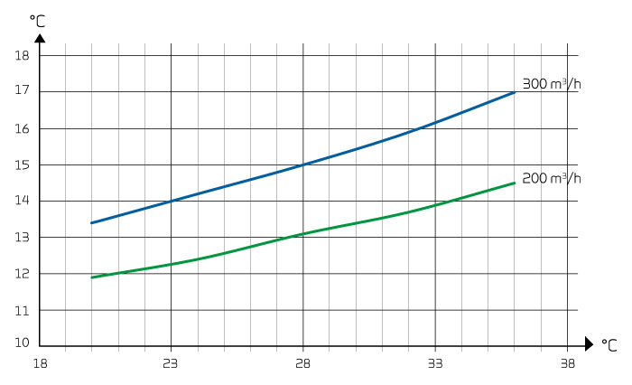Teplota přiváděného vzduchu [° C] jako funkce teploty venkovního vzduchu [° C] a objemového průtoku qv [m3 / h] vyváženého průtoku. Teplota odpadního vzduchu = 21 [ºC], 45 RV [%]